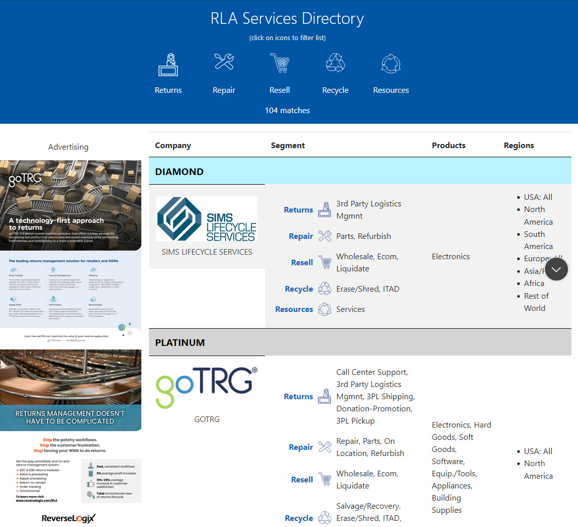 The Reverse Logistics Association (RLA) is pleased to announce The Reverse Logistics Directory of Tools and Service Providers. The directory, a dynamic database, provides contacts for resources such as software, equipment, and consultants and a listing of third-party service providers segmented into functions – returns, repair, resales, and recycling. In addition, extensive profiles of companies are also included. This tool will help manufacturers, retailers, and other businesses to identify potential partners and resources to augment their returns management.