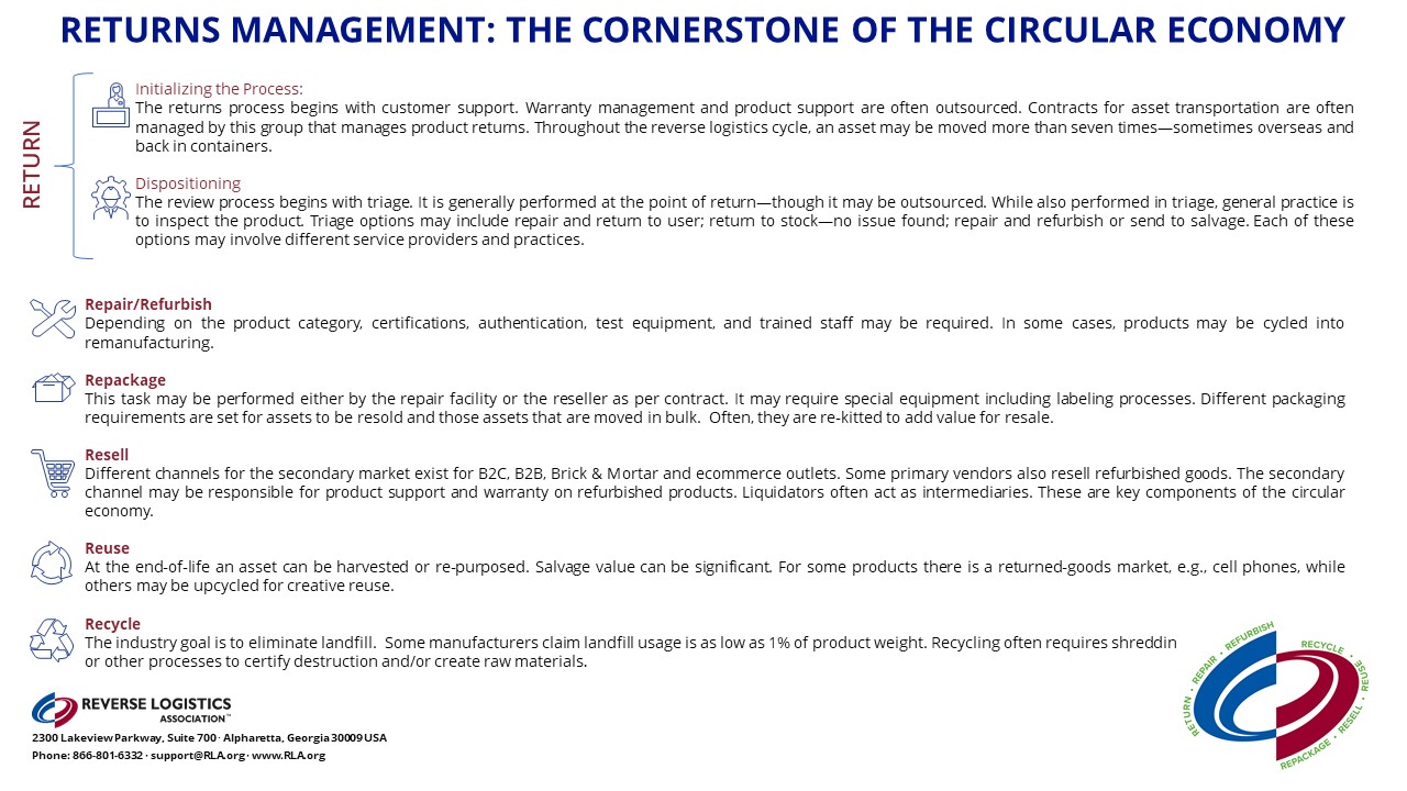 This is a question with many answers, and one the Reverse Logistics Association has been engaged with since its inception. As technology has changed the products and services on offer in the world, the reverse logistics needs have also changed. The RLA has recently published a diagram of the Reverse Logistics Ecosystem.